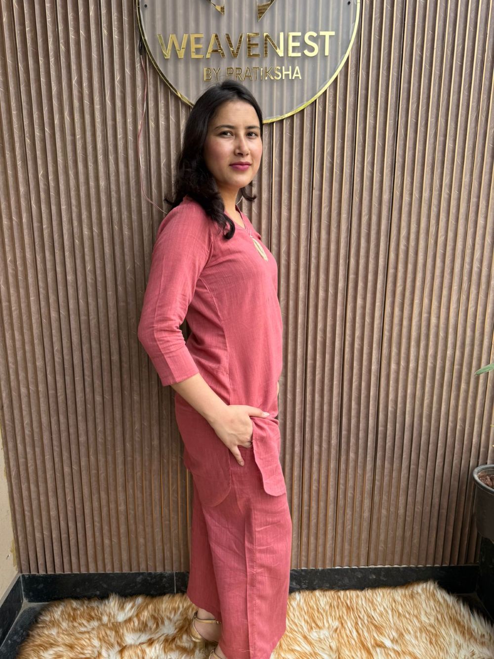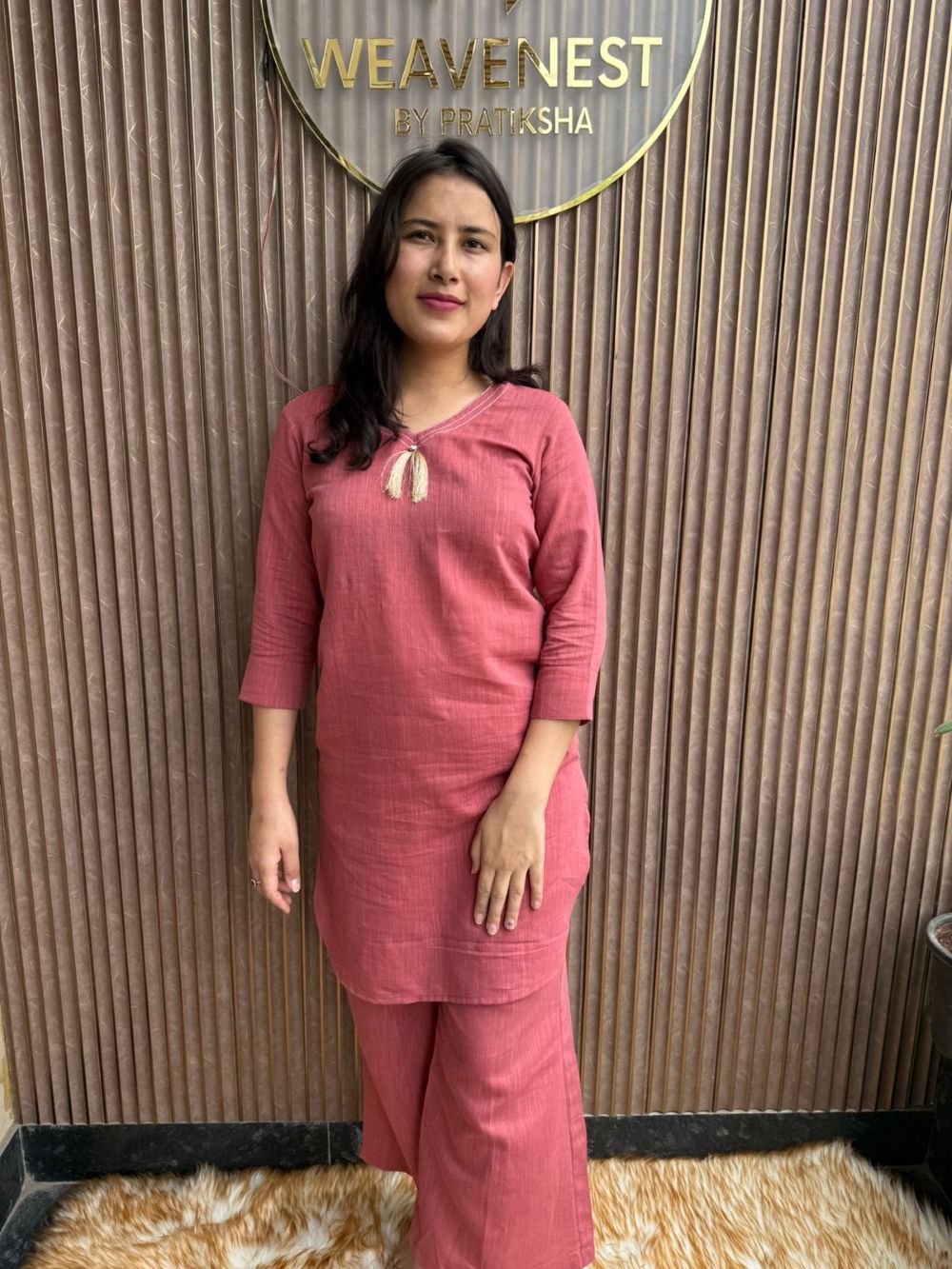 A relaxed two-piece set in a warm rosewood hue, featuring a straight-cut kurta with 3/4 sleeves and subtle tassel detail at the neckline, paired with wide-leg pants for effortless everyday elegance.
