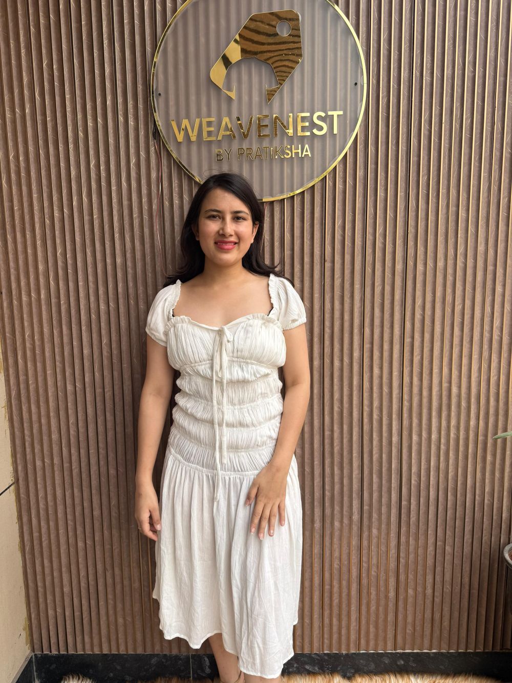 Designed with a ruched bodice and gently puffed cap sleeves, it gracefully flatters the figure while offering comfort and breathability. A dainty front-tie detail adds a charming vintage touch, while the flowy skirt creates effortless movement.