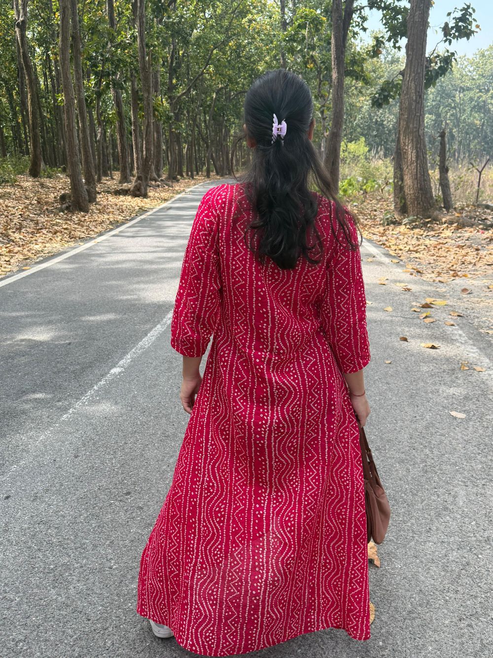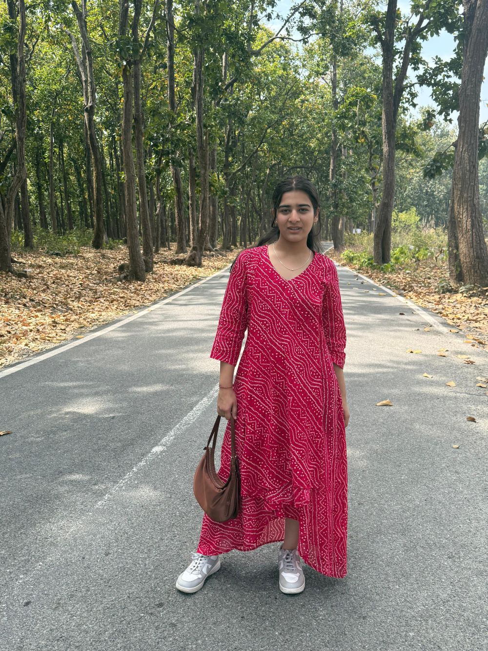 A vibrant fuchsia maxi dress adorned with tribal-inspired prints, featuring a V-neckline and 3/4 sleeves. The flowy silhouette and casual styling with white sneakers and a tan crescent bag make it perfect for daytime strolls or outdoor getaways.
